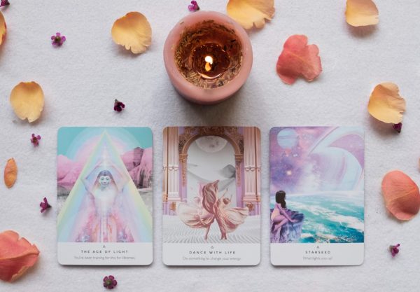 Olika orakelkortlekar och tarotkortlekar som vibrer ljus, framtid och goda toner används vid vägledningarna.